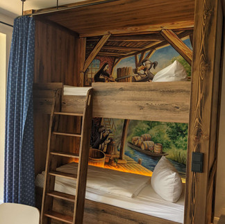 It's a water park and resort in one. This means you can opt for either a day or overnight visit, making it suitable for various budgets. We spent one night and I was most pleasantly surprised with our room! Most pleasantly! Perhaps the best part was the penguin bunk beds which kids will love. The accomodation was very spacious, immaculately clean and well outfitted with a dishwasher and furnished kitchen. This gave us the options to prepare our own meals which worked so well! The bathroom had a unique and relaxing touch with an immersive photo of Spreewald. There was also a simple yet inviting balcony with access to lawn space where the kids can let off energy.